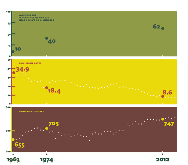 featuresGrade expectationsFifty years ago, ten percent of Yale College grades were A’s or A-minuses. Now it’s 62 percent. A faculty committee thinks that number is too high. Robert McGuire is a writer and writing teacher in New Haven and the editor of MOOC News and Reviews. ![]() Barry FallsView full image“Once you look at the numbers, you can’t quite believe grade inflation has gotten as bad as it has,” says Tina Lu, a Yale professor who chairs the Department of East Asian Languages and Literatures. “Things have gotten to a point where it seems something really ought to be done.” For Lu and her fellow members of the Yale College Ad Hoc Committee on Grading, the numbers speak for themselves: in spring 2012, 62 percent of all grades at Yale College were an A or A-minus, compared with 10 percent in 1963 and 40 percent in 1974. But some students and faculty argue that a more consistently excellent student body is responsible for at least part of the rise. This fall, the Yale College faculty will consider the committee’s recommendations for changes to the grading system. Yale College dean Mary Miller ’81PhD decided to form the committee in 2012, when she heard that a 3.8 grade point average was the cutoff for Latin honors (cum laude and above), which are limited to the top 30 percent of the class. “When Dean Mark Schenker stood up to read these numbers, I said, ‘Let’s study what’s going on here.’” Miller remembers. “Let’s begin the conversation that has been quite conspicuously absent. Surely an academic institution like ours has the responsibility to study the kind of decisions it may be making, especially when they might not be fully articulated.” The committee presented its report to faculty in April. In addition to documenting the rise in the number of A’s and A-minuses over the last 50 years, the report includes data supporting the conventional wisdom that grades are higher in the humanities. But recent increases are more prominent in the natural sciences, where the mean is up 0.22 points on the 4.0 scale between 1999 and 2012. In some departments, there’s almost no room left in the scale for inflation. In fact, says Lester Hunt, a professor of philosophy at University of Wisconsin–Madison who edited the book Grade Inflation, inflation is a misleading metaphor. “Unlike money, grades are a closed system,” he says. “There is a highest grade, but there’s no such thing as a highest price, so what happens is, as grades go up, they get squished at the upper end.” And the ad hoc committee prefers to keep the focus on compression rather than inflation. “It would be the same problem if 68 percent of the grades were C-plus or B-minus,” says economics professor Ray Fair, the chair of the committee. “You still wouldn’t have the ability to separate out the really good students from the okay but not great students, because almost everybody is getting the same grade.” Besides making it harder to recognize outstanding performance, the committee maintains, grade compression discourages students from working their hardest, “muddies the effectiveness of grades as signals to outside organizations,” and, because of different standards across disciplines and departments, may unduly affect students’ decisions about what courses to take. ![]() Chart: Mark Zurolo ’01MFA. Sources: Yale Book of Numbers, Office of Institutional Research.Yale College hasn’t publicly released year-by-year data on grades, but the report of the Ad Hoc Committee on Grading provided numbers for 1963, 1974, and 2012. We also show here the increase in SAT scores and the decrease in the admission rate for classes during the same period. SAT scores are an average of math, verbal, and, since 2010, writing scores. (The SAT was “recentered” in 1995 to make 500 the median, so scores in 2000 and later are 30 to 40 points higher than they would have been before recentering.) View full imageIn its April report, the committee proposed four changes to remedy the situation. Two of them were approved by the faculty with no controversy: to encourage discussion about grading policies in each department by requiring chairs to submit a report to the Yale College dean annually about those policies; and to distribute data to faculty every year on the average grades in every department (as was the practice before 1982). Two other proposals, though, encountered more resistance. The first is to “exchange the currency” by converting from the familiar letter grades to a number system in which passing work is scored between 60 and 100. The second is to establish non-mandatory guidelines for departments to follow, with the hope of spreading grades along the following curve: 35 percent of grades in the 90–100 range, 40 percent in the 80–89 range, 20 percent in the 70–79 range, and 4 or 5 percent in the 60–69 range; 0 or 1 percent would be failing. (All failing work would be assigned a grade of 50 under the number system.) As the ad hoc committee prepared to present recommendations to faculty, it started running into opposition from students who objected to both the numerical grading system and the grade distribution guidelines. Through the Yale College Council, students appealed to faculty to send the two proposals back to the committee, arguing that rising grades were not necessarily a sign of relaxed standards. “There’s been a cultural change, with a huge emphasis on achieving competitive grades, that didn’t exist 40 years ago,” says YCC president Daniel Avraham ’15. “There are several natural trends that contribute, and it isn’t just that professors are too generous.” Some faculty are skeptical of the argument that current students are simply more capable of A-level work. “Sheer nonsense,” says engineering professor Alessandro Gomez. “Nothing remotely like that is the case,” says philosophy professor Shelly Kagan. (Gomez and Kagan have reputations as b