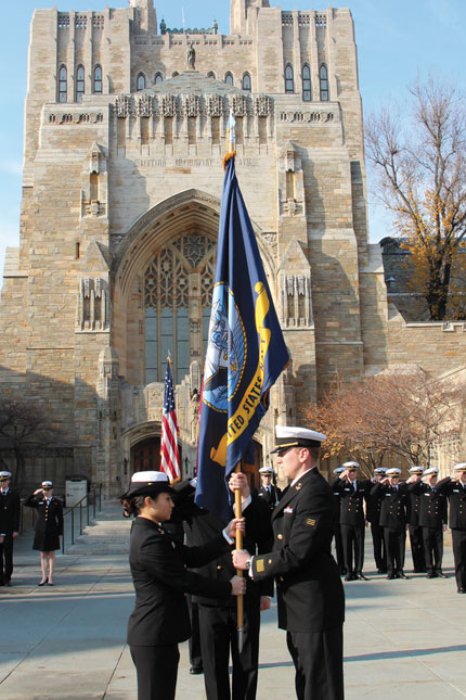 From the EditorShipshapeGabrielle Fong ’16 is the first woman to lead a Yale ROTC battalion. ![]() Midshipman Max Graham ’18View full imageEarly on, we at the Yale Alumni Magazine knew our intern Gabrielle Fong ’16 was something special. She finishes tasks in record time. She always takes the initiative. And (if you know any college students, this one will be jaw-dropping) she asked to come into the office at 7:30 some mornings to get her work done. Gabby, a history major who grew up in Louisville, Kentucky, doesn’t come from a military family. In high school, she wanted to be a military legal officer and she wanted to fly, so she planned to apply to the Air Force Academy. A counselor suggested she also consider the Naval Academy. She visited each, and there was no contest: she loved “the camaraderie surrounding the culture of the Navy.” Once she found out about NROTC, Gabby chose Yale, which she values for “the really great dialogue” on campus. She was the first woman in Yale NROTC. She was appointed battalion commander by the six Navy officers who oversee the Yale unit, based on her “military aptitude”: physical fitness, uniform prep, ability to work well with others, ability to command respect, and follow-through. At the ceremony, Gabby outlined her goals for the 46 Yale College midshipmen standing in formation in front of Sterling Library. She stressed uniforms, because the NROTC represents the Navy. As she told me later, “the minimum standard should be that you always look good”: at all times, your shoes should be shined and three creases ironed into the back of your blouse. She cares deeply about leadership. She’s organizing an NROTC leadership conference, to “establish ourselves nationally among our NROTC peers and bring people together.” And she wants the battalion to work on personal development and self-awareness. Gabby has taken the free leadership courses offered at SOM, and she believes in addressing our own flaws to become “the best versions of ourselves.” We are impressed. Or, as the midshipmen said: “Aye, aye, ma’am.”