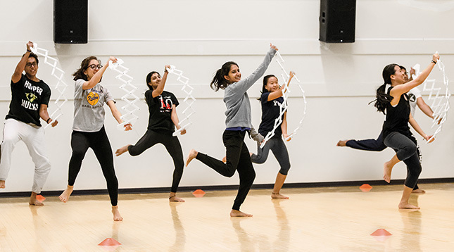 Tasneem Islam ’18MEM (center) leads a group that performs the Punjabi folk dance known as Bhangra, which Islam describes as “very high energy, with musical beats reminiscent of hip hop.” The dancers are working with traditional props called saaps.