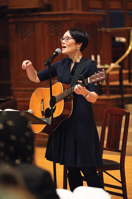 Rabbi Angela Buchdahl ’94, senior rabbi at New York City’s Central Synagogue, leads services in Battell Chapel as part of a two-day Asian Jewish gathering last fall organized by Yale’s Asian Jewish Union and the Slifka Center.