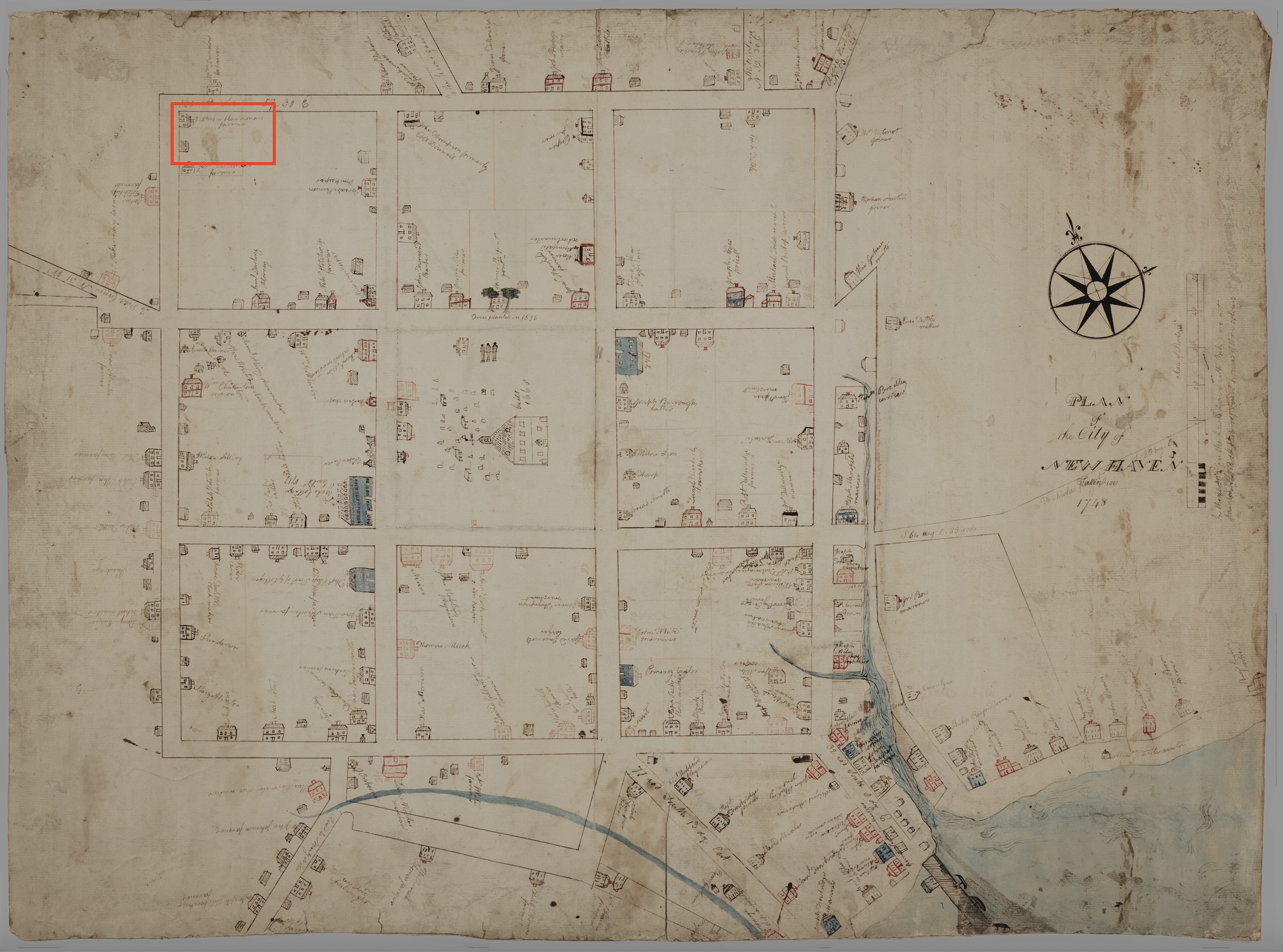 It began for me in 2017 with a mark on a map of New Haven from 1748 made by James Wadsworth, a Yale College senior from nearby Durham. It tracks to Ashmun, Grove, and York Streets, now a small city park adjacent to Grove Street Cemetery.