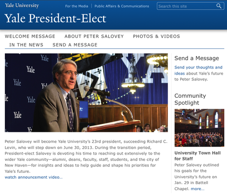 Give Yale's next president a piece of your mindSons and daughters of Eli: you never call, you never write. President-elect Peter Salovey ’86PhD wants so badly to hear from you that he's set up a website to make it easy: president-elect.yale.edu. In an e-mail to the Yale community, Salovey says the site is "designed to gather your suggestions and ideas about how we can, together, build on the momentum of the last 20 years to create an even more unified Yale, a more accessible Yale, a more innovative Yale, and a more excellent Yale." Drop him a line already, will ya?