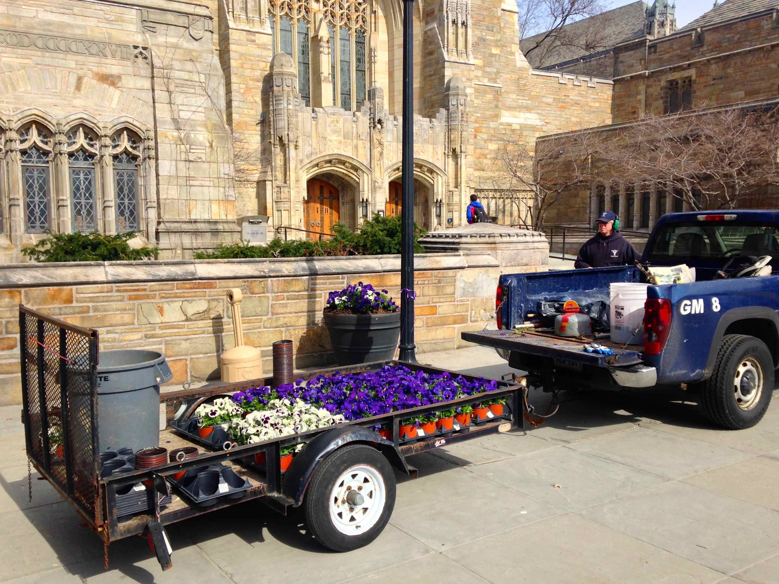 Sunday was our first warm, sunny spring day, with the sidewalks and courtyards suddenly full of people. A day later, we spotted a Yale Grounds Maintenance crew populating the campus with pansies. ___________________________________________ The Yale Alumni Magazine is published by Yale Alumni Publications Inc., an alumni-based nonprofit that is not run by Yale University. Its content does not necessarily reflect the views of the university administration.
