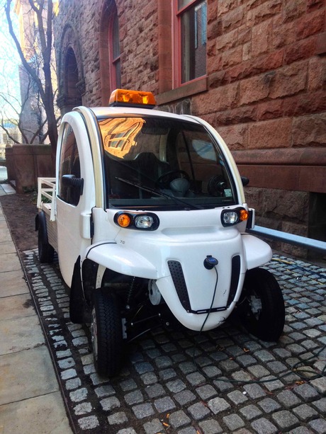 Every morning as we walk down the alley between McClellan Hall and Linsly-Chittenden Hall on the Old Campus, we're greeted with a smile by this electric vehicle charging up for its new day. We always smile back.