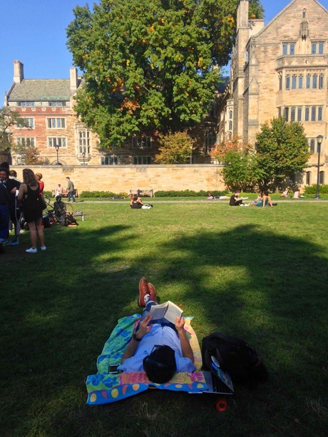 We’re enjoying sunny weather, and it’s warm enough that a reclining reader on Cross Campus might even seek out some shade in the middle of the day.