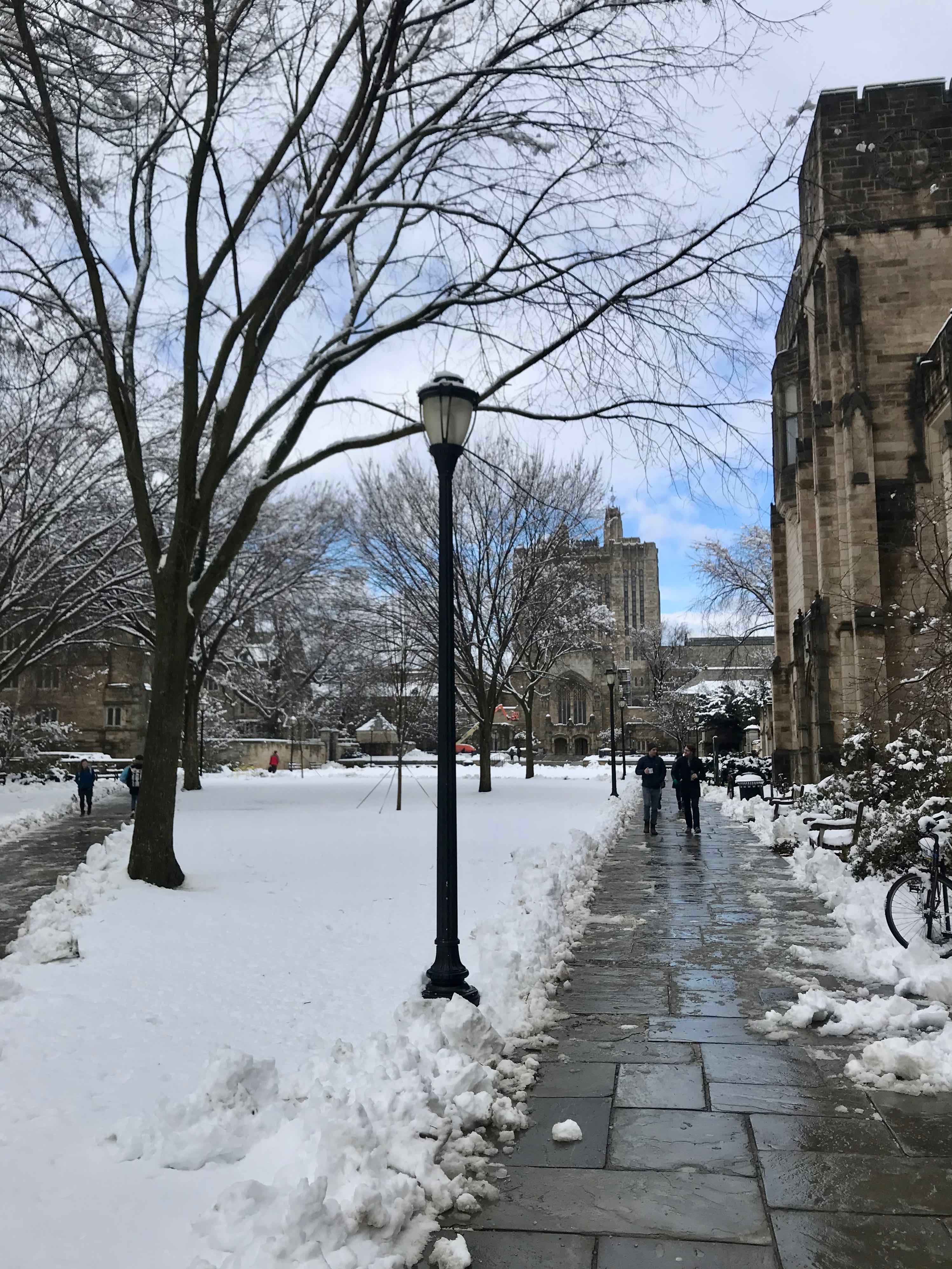 We’re sharing another picture of yesterday’s snow, because, well, who doesn’t like pictures of snow? But we also wanted to note that New Haven got 9.5 inches of snow between 9 pm Sunday and 5 am Monday, and the campus sidewalks were all passable on time for morning classes. Nice work, Yale Grounds Maintenance!