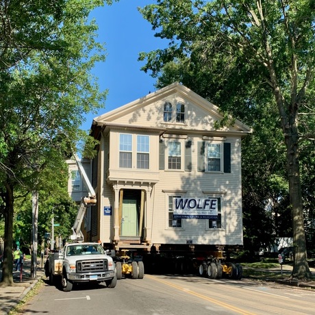 Traffic was stopped on Trumbull Street Saturday morning as a house once owned by Benjamin Silliman was carried a block down the street to a new location in a university parking lot. A new economics building is planned for the house’s former site at 87 Trumbull.