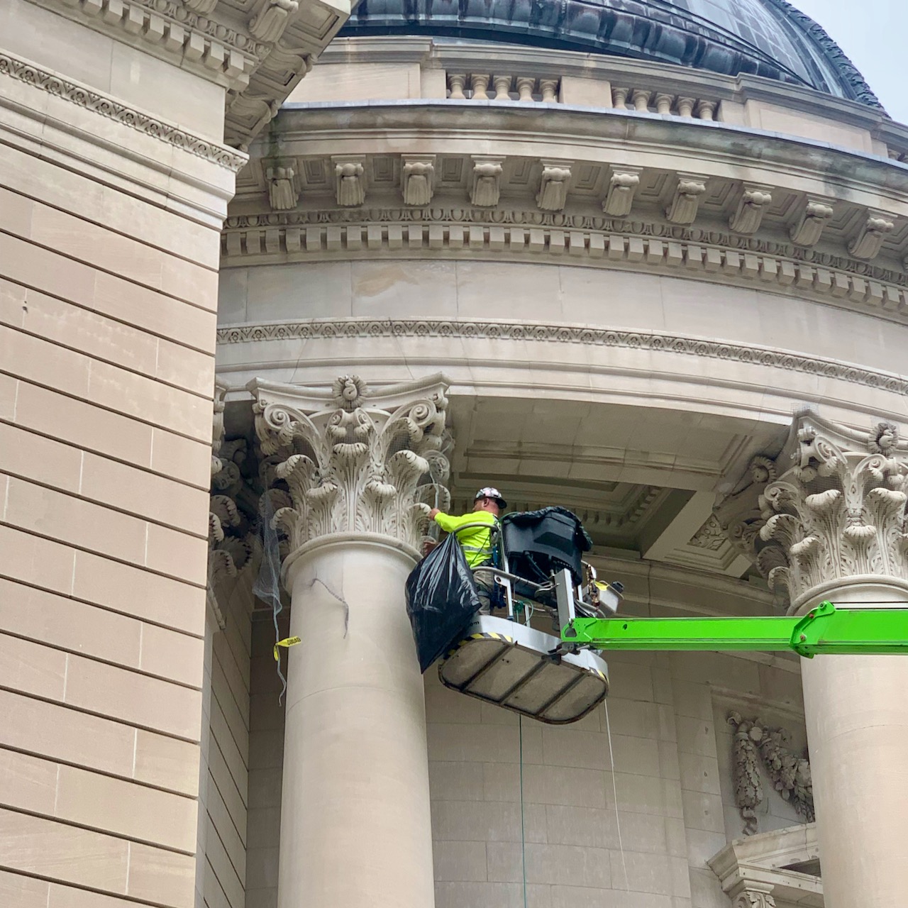 We spotted this worker installing mesh to keep pigeons off the capitals of the columns of Memorial Hall earlier this week. Non-pigeons will soon be welcome at the new Schwarzman Center.