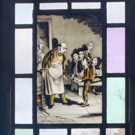 The comment period has expired.<> Oliver Twist, Chapter 2. The orphan Oliver is living in a workhouse. He draws lots with the other boys, and now must be the one to ask the master "Please sir, I want some more." [More gruel that is.] <> I would guess this stained glass piece is in the Librarian's House in Selin Court, Sterling Memorial Library. I am told that in one certain room there all of the stained glass pieces are about cooking and serving food.