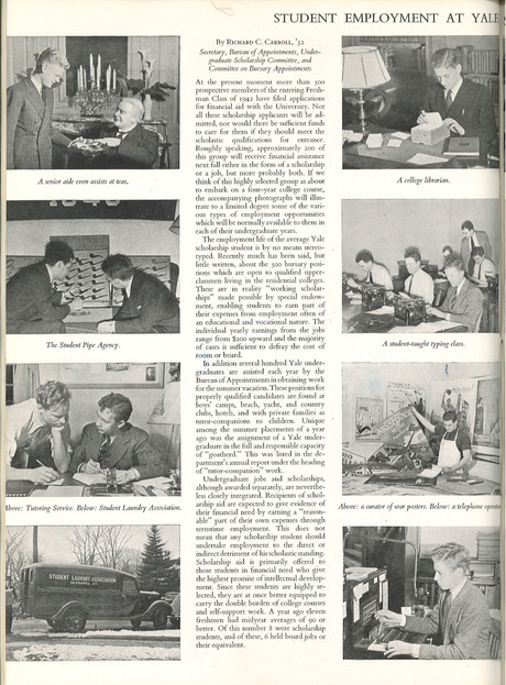 In April 1938, we featured some of the many jobs students did as part of their financial aid package, from tutoring to the Student Pipe Agency. Alums, tell us about the unusual ways you earned money as a student.