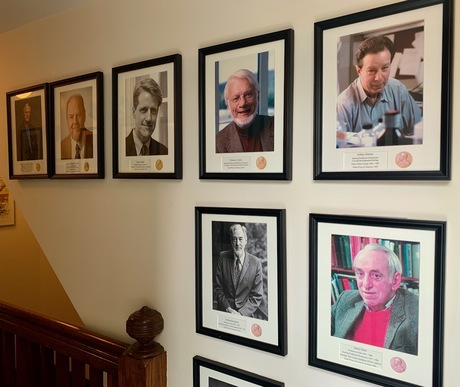 Stockholm syndromeOld Blues will remember the walls of Mory's covered with framed photos of varsity captains. But in recent years, the tavern has made room for other kinds of portraits. The corridor leading to the Governors Room features Yale faculty members past and present who have won the Nobel Prize. If you're keeping track: On the top row, left to right, are William Nordhaus ’63, James Rothman ’71, Robert Shiller, Thomas Steitz, and Sidney Altman. Tjalling Koopmans and James Tobin are on the second row. Beneath them (not shown in photo) are George Palade and Lars Onsager ’35PhD.