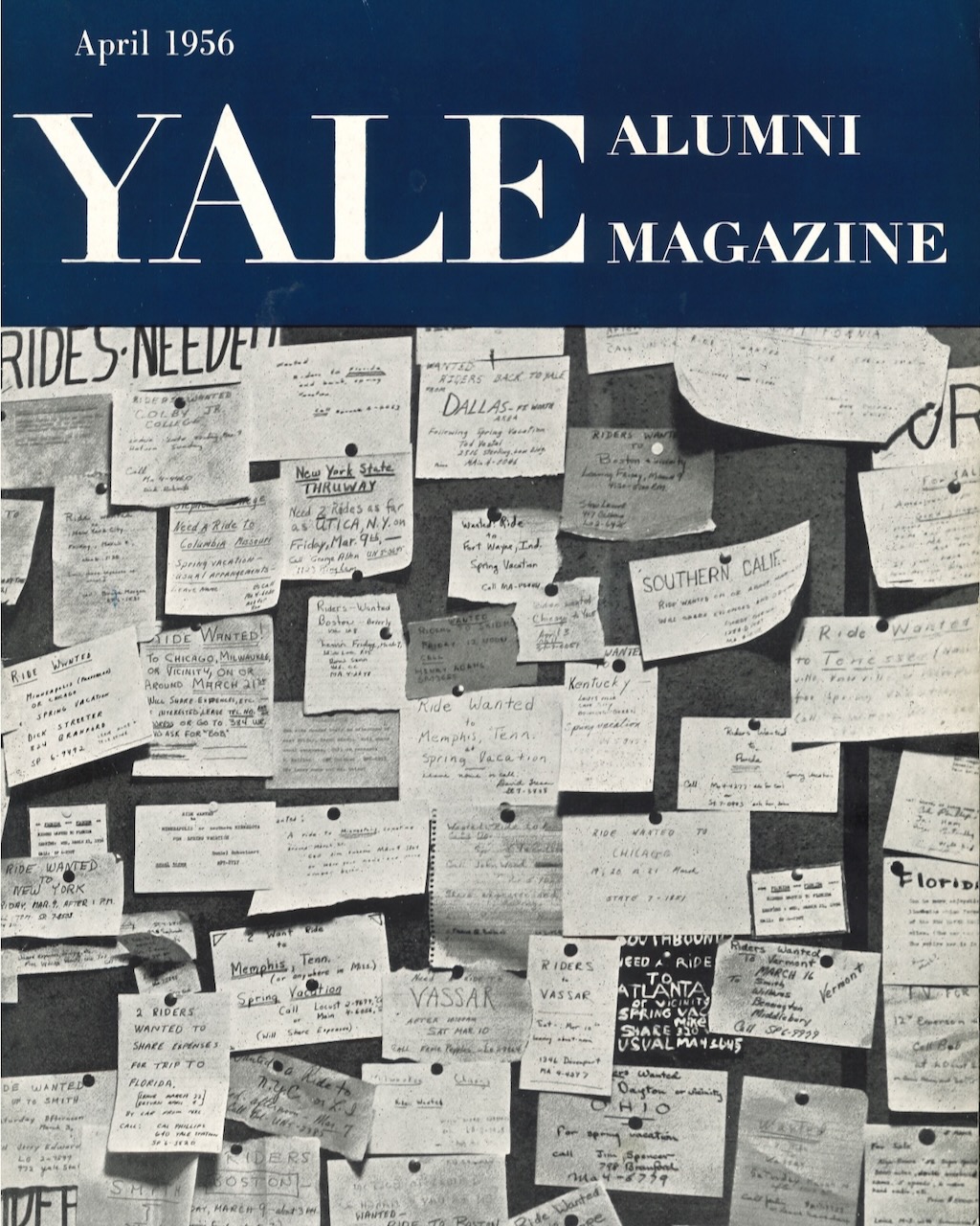 Our April 1956 cover featured a critical means of student communication in the corridor of Yale Station: the ride board. Alums, do you have any road trip stories?
