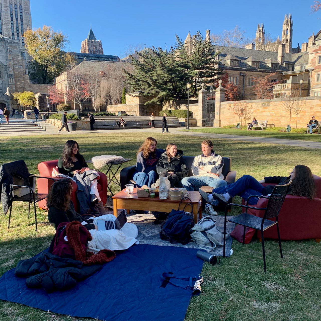 Most students are away on Thanksgiving break now, but last Thursday we happened on this group, who decided the only way to truly appreciate a mild late-fall afternoon was to move their common room out onto Cross Campus.
