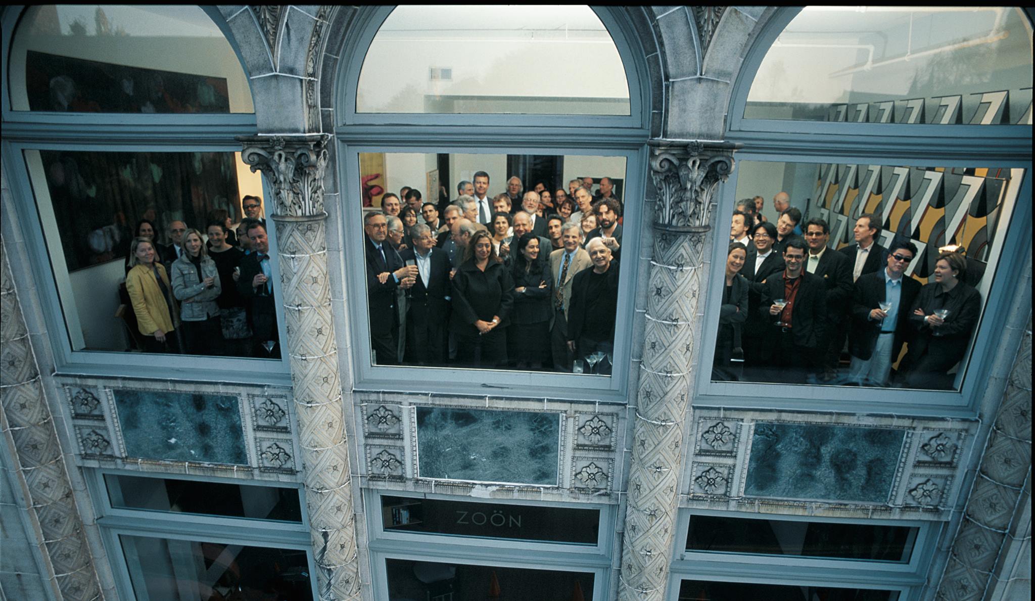 The recent deaths of former School of Architecture dean Robert A. M. Stern ’65MArch and former visiting faculty member Frank Gehry reminded us of this photo that appeared in our July/August 2004 issue. We hired photographer Mark Ostow to go up in a cherry picker (this was before drones, kids) and get a shot of a cocktail party in Stern's third-floor apartment on Chapel Street overlooking the Green. The occasion was the end of final reviews in the spring semester at the architecture school. Stern is third from left in the leftmost window. Gehry is at right in the center window, which also includes former deans Cesar Pelli and Thomas Beeby and Pritzker Prize winner Zaha Hadid.