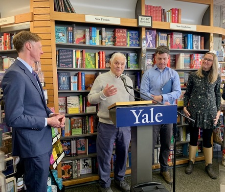 Books and bread and black bean soup“Countless tears are dropped into Atticus bread baskets. Here Yalies apologize, discuss, court, forgive, and remember.” Back in 1996, Michelle Chihara ’96 explained in our pages what made Atticus Bookstore Café the campus's preeminent coffeehouse. Yesterday, Yale —Atticus's landlord since 1975—celebrated the store's 50th anniversary. Associate Vice President for New Haven Affairs and University Properties Alexandra Daum (right) served as emcee, and Mayor Justin Elicker ’10MBA, ’10MEM (left) brought an official proclamation. Founder Charles Negaro Sr. (second from left) talked about how he spotted the available storefront in the Center for British Art in 1975 and decided to leave his law practice and open a bookstore. Six years later, he added food and coffee, making Atticus the first bookstore-café in Connecticut. Negaro and his son Charles Jr. (second from right), who has run the business since 2019, also started a bakery, Chabaso Bread, and a café-market in East Rock called Atticus Market. Alums, tell us your memories of Atticus! |