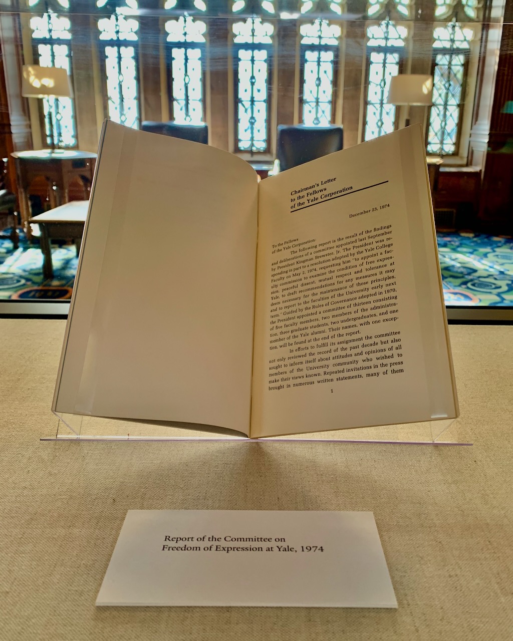 When the Linonia and Brothers Reading Room in Sterling Memorial Library was renovated, the shelves of its foyer were lined with books about Yale and New Haven history. On display in the space is a copy of the landmark 1974 Report of the Committee on Freedom of Expression at Yale, better known as the Woodward Report. |