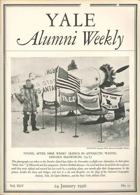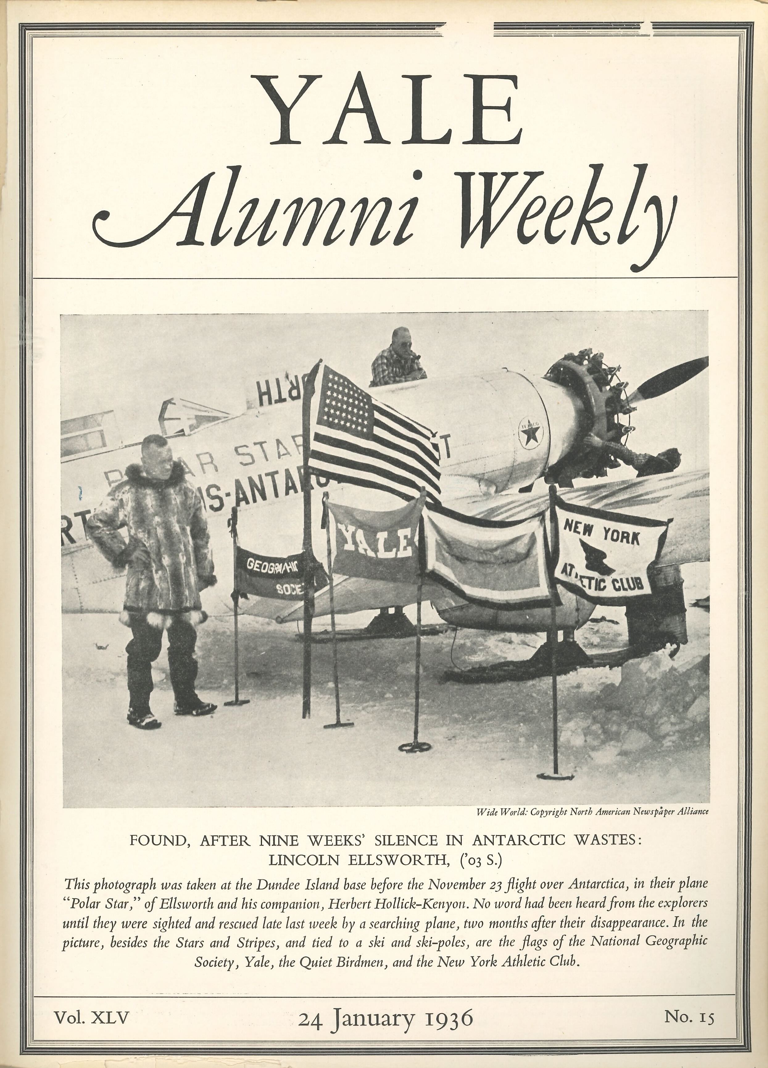 Ninety years ago, we featured polar explorer Lincoln Ellsworth ’03S on our January 24, 1936, cover. Ellsworth and Herbert Hollick-Kenyon had just been rescued after being lost for nine weeks in the icy wastes of Antarctica. After the last few days in New Haven, we can kind of imagine. |