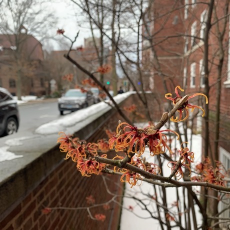 Every year, we look for witch hazel in bloom to reassure us that spring isn't far away. We found this specimen on Grove Street in a Silliman College moat.